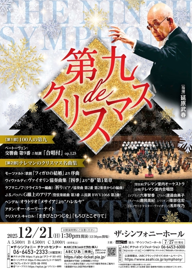2025年12月21日(日) 日本テレマン協会 第九 de クリスマス 2025.07.122025.09.23ベートーヴェン「第九」、クリスマス名曲集 バスソロ@大阪 ザ・シンフォニーホール 13:30開演