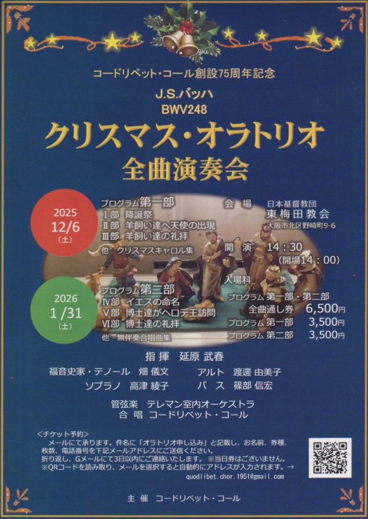 2026年1月31日(土) コードリベット・コール創設75周年記念クリスマス・オラトリオ全曲演奏会 第二部 2025.09.23バッハ「クリスマス・オラトリオ 第4〜6部」バスソロ@大阪 東梅田教会 14:30開演